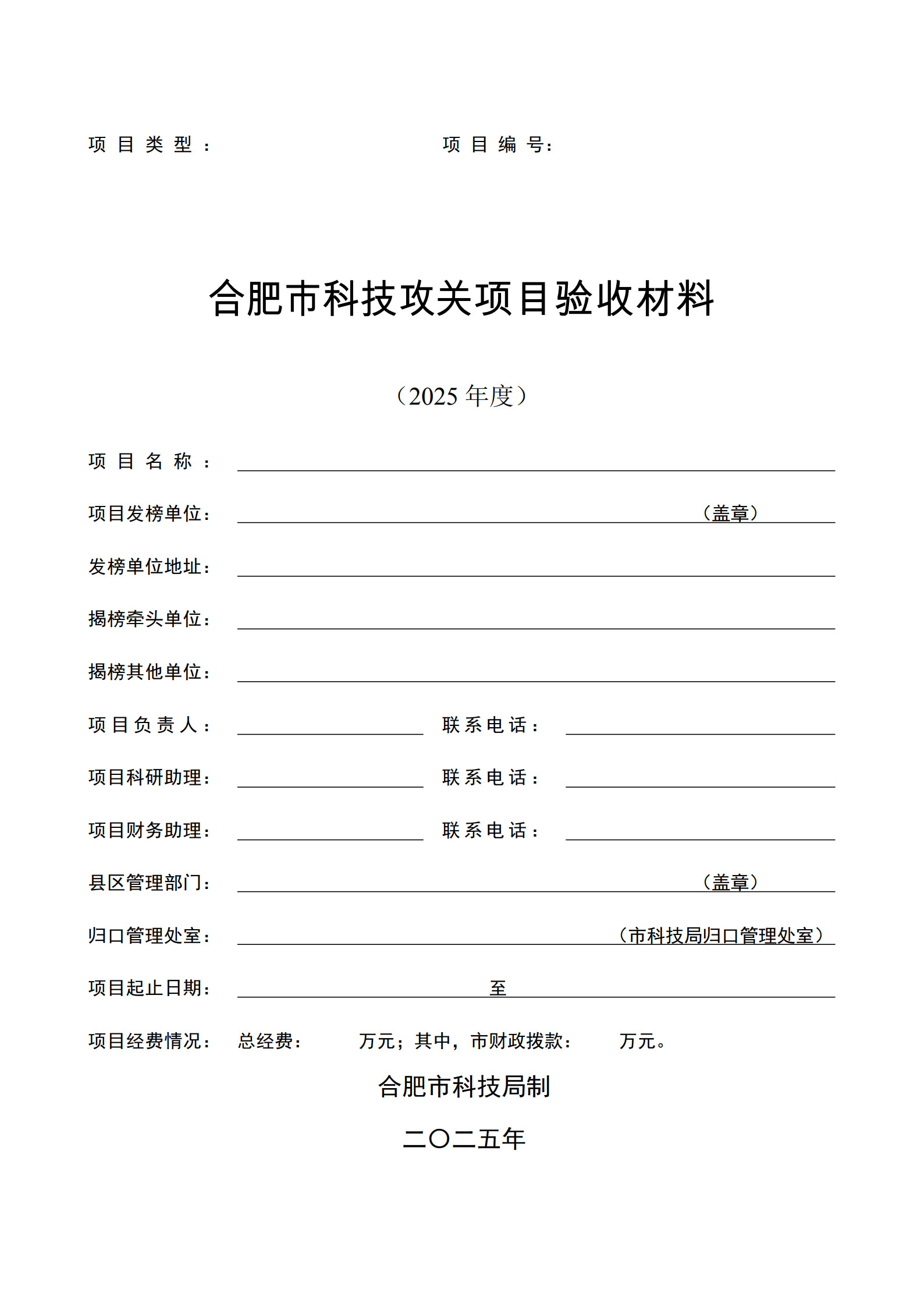 根据《合肥市科技攻关“揭榜挂帅”项目管理办法(修订)》(合科〔2025〕65号)及有关规定,现将2025年上半年市级科技攻关项目集中验收工作通知如下。