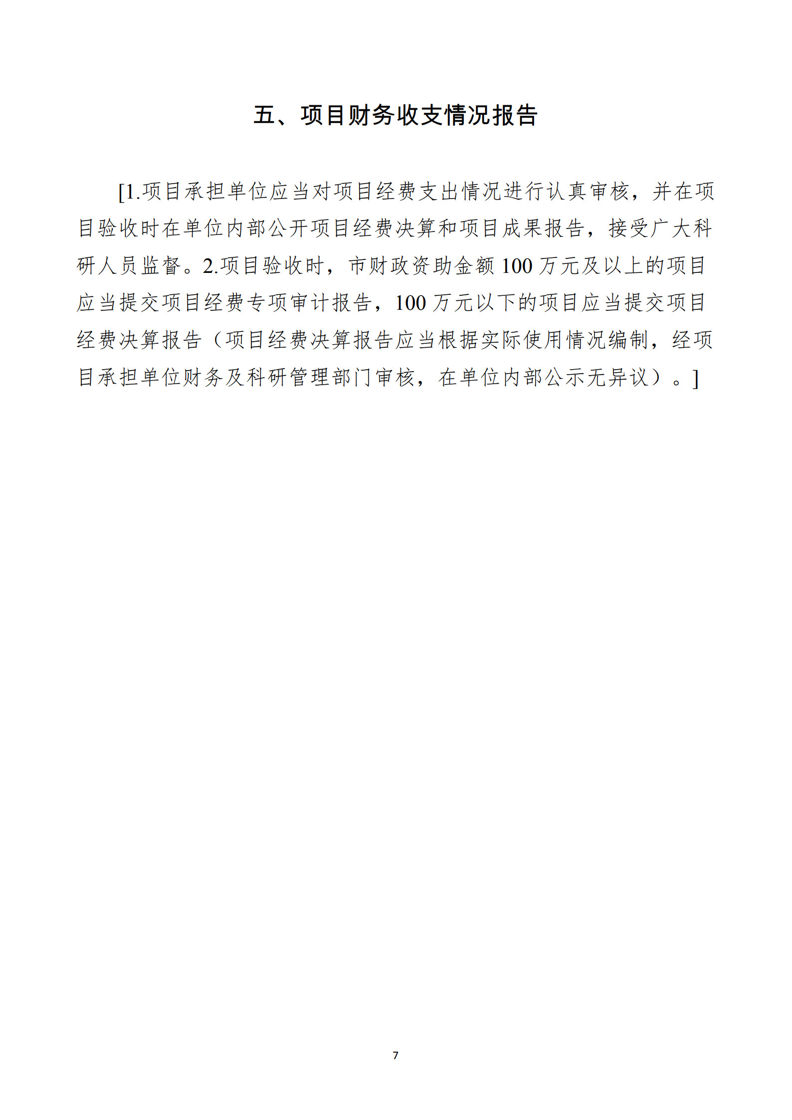 5.项目财务收支情况报告(市财政资助金额100万元及以上的项目应当提交项目经费专项审计报告,100万元以下的项目应当提交项目经费决算报告);