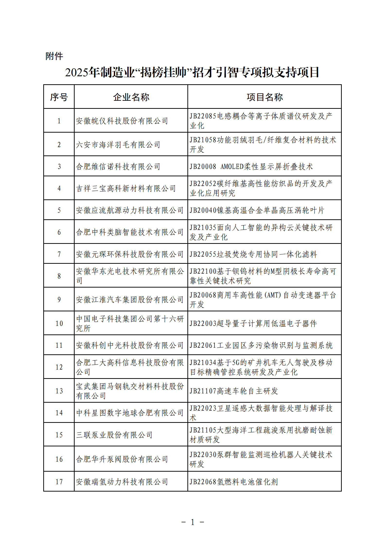根据安徽人才政策4.0版等有关规定,现将制造业“揭榜挂帅”招才引智专项拟支持项目予以公示。